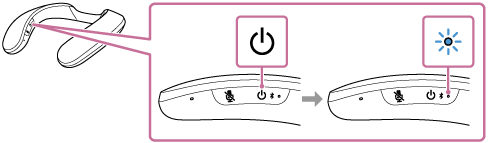 (BLUETOOTH) timp de 2 secunde până când auziți mesajul de ghidare vocală (Power ON (Pornire)).Boxa portabilă din jurul gâtului pornește și indicatorul începe să clipească în albastru.