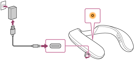 Dacă bateria încorporată este complet încărcată când conectați boxa portabilă în jurul gâtului la o priză c.a. printr-un adaptor c.a. USB disponibil în comerț, indicatorul se aprinde în portocaliu, iar apoi se stinge în aproximativ 1 minut.
