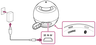 - 在极冷或极热的环境中,会出于安全考虑,停止充电。当环境恢复工作温度的范围内时,经重新开始充电。如果长时间充电,CHARGE指示灯可能以橙色保持快速闪烁。这并非故障。拔出微型USB电缆,并在工作温度内的环境内将其插入,以再次对扬声器充电。
