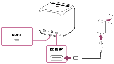 - En højttaler, der er i brug, kan lades op, hvis den tilsluttes en stikkontakt – også selvom der ikke er lys i indikatoren CHARGE. Afhængigt af brugsbetingelserne kan opladningen af batteriet i dette tilfælde tage længere tid, end når højttaleren er slukket. Det anbefales derfor, at højttaleren slukkes, før den lades op.
