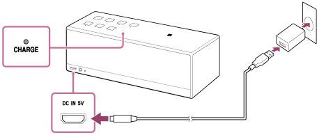 - L’enceinte peut être chargée alors qu’elle est connectée à l’adaptateur secteur USB fourni, même si elle reproduit de la musique. (Le témoin CHARGE ne s’allume pas.) Toutefois, comme la durée du chargement peut être plus longue, selon les conditions d’utilisation, nous vous recommandons de mettre l’enceinte hors tension pendant le chargement.