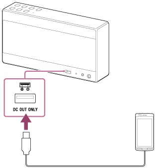 - Raccordez un périphérique USB tel qu’un smartphone au port DC OUT ONLY (USB) à l’aide d’un câble USB (non fourni).