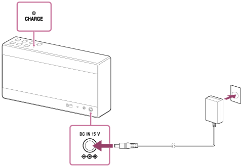 充电开始,并且CHARGE指示灯以橙色点亮。充电将在约四小时*1后完成,然后指示灯熄灭。一旦电池充满,即使扬声器继续与交流电源插座相连,也不会进一步充电。