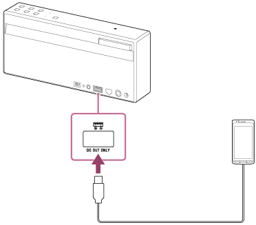 - Anslut en USB-enhet, t.ex. en smartphone till DC OUT ONLY-porten (USB) via en USB-kabel (medföljer ej).