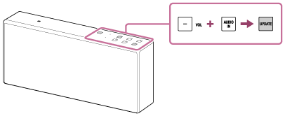 - Antalet gånger som UPDATE-knappen kommer att blinka ändras allt eftersom uppdateringen fortskrider. UPDATE-knappen blinkar först fyra gånger och minskar sedan med en blinkning och slocknar när uppdateringen är genomförd. Stäng inte av högtalaren under uppdateringen.