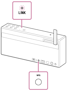 (打开/待机)指示灯以绿色点亮,然后LINK指示灯开始闪烁。当LINK指示灯缓慢闪烁(每三秒一次)时,转至下一步。购买后第一次配置扬声器的设置时,或初始化扬声器后,这种缓慢闪烁有时候可能需要约四分钟或五分钟才能开始。