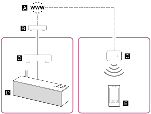 : Smartphone/iPhoneFordeler forbindelsen via en netværkshub eller et Wi-Fi-adgangspunkt, der er indstillet til infrastrukturtilstand, når det er svært at slutte højttaleren og din smartphone/iPhone direkte til én router (f.eks. når du bruger SongPal på en smartphone/iPhone, der er anbragt i et andet rum end højttaleren).