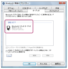 - [Bluetooth無線のプロパティ]画面が表示されるので、 [オーディオ]タグで[SRS-X88]を選び、[接続]をクリックする。