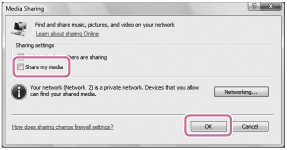 - Als [Share my media] niet aangevinkt is op het scherm [Media Sharing] dat weergegeven wordt in stap 2, voegt u een vinkje toe en selecteert u [OK].