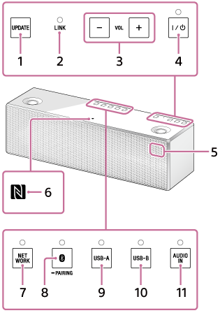 PAIRING按钮/指示灯*轻触可将扬声器切换到BLUETOOTH模式或配对模式。