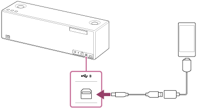 يمكنك توصيل جهاز Walkman مدعوم بالدقة العالية بمكبر الصوت باستعمال كابل WM-PORT بمحول USB ذو صوت عالي الدقة الاختياري* وكابل USB متوفر بالأسواق.