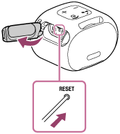 Hvis høyttaleren ikke kan slås på, eller den ikke kan betjenes selv om den er slått på, åpner du hetten på høyre side og trykker på RESET-knappen med en nål eller en annen spiss gjenstand. Høyttaleren vil da tilbakestilles og slås av.