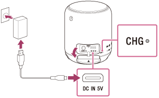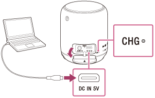 Зарядтау кезінде CHG (зарядтау) индикаторы қызғылт-сары болып жанады. Динамикті 500 мА шамасында шығару мүмкіндігі бар USB құрылғыға қосқанда, зарядтау уақыты шамамен 4 сағат және 30 минут*1. Уақыт сыртқы ортаның температурасына немесе қолдану шарттарына байланысты өзгеше болуы мүмкін.