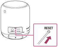 Öppna locket på baksidan och tryck på RESET-knappen med en nål eller annat spetsigt föremål i cirka 2 sekunder om det inte går att starta högtalaren eller inte går att använda den trots att den är startad.