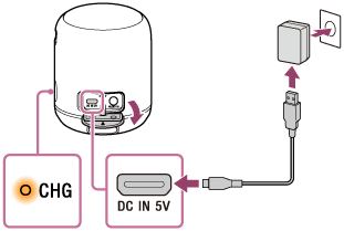micro-USB кабелін (бірге берілген) динамиктегі DC IN 5V ұясына жалғаңыз, одан кейін екінші ұшын USB АТ адаптеріне жалғаңыз (сатып алуға болады). Содан кейін USB АТ адаптерін АТ розеткасына қосыңыз.