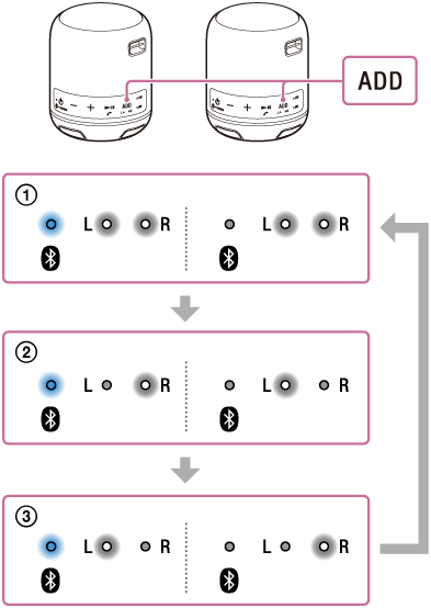 Стерео режим (L арнасы/R арнасы):Бір динамикте R (оң жақ) индикаторы өшеді, ал L (сол жақ) индикаторы ақ түспен жанады. Екінші динамикте L (сол жақ) индикаторы сөніп, R (оң жақ) индикаторы ақ түспен жанады.