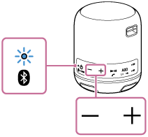 Justera volymen genom att trycka på knapparna –/+ (volym) på högtalaren eller genom att använda BLUETOOTH-enheten.