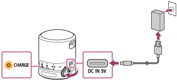 Dersom det innebygde batteriet er fulladet når du kobler høyttaleren til et strømuttak med en USB-vekselstrømadapter (alminnelig tilgjengelig), vil CHARGE-indikatoren lyse oransje og deretter slå seg av etter ca. 1 minutt.