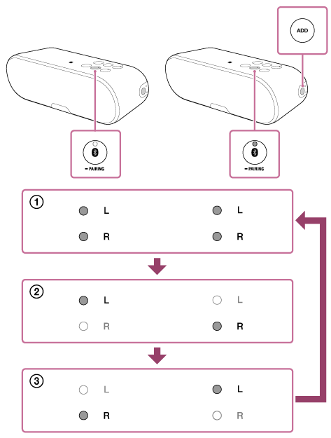 وضع الستيريو (R ch/L ch): ينطفئ المؤشر L، ويضيء المؤشر R باللون الأبيض على أحد مكبرات الصوت. على مكبر الصوت الآخر، ينطفئ المؤشر R ويضيء المؤشر L باللون الأبيض.