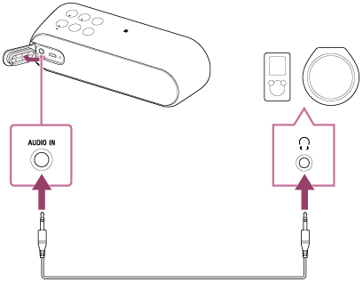 - เมื่อใช้สายสัญญาณเสียงกับลำโพง อุปกรณ์ที่เป็นแหล่งสัญญาณเสียงจะเปลี่ยนไปเป็นอุปกรณ์ที่เชื่อมต่อด้วยสายสัญญาณเสียงโดยอัตโนมัติ แม้ว่าท่านจะรับฟังเพลงผ่านการเชื่อมต่อ BLUETOOTH อยู่ก็ตาม