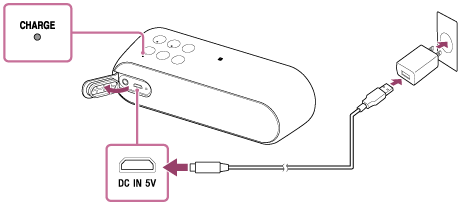 - 如果正在使用的扬声器连接到交流电源插座,即使CHARGE指示灯未点亮,也可以为其充电。这种情况下,根据使用情况而定,电池充电时间可能会比扬声器关闭时要长。因此,建议在充电时关闭扬声器。