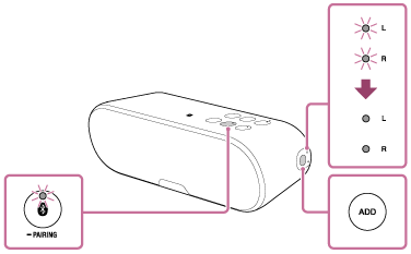 (BLUETOOTH)指示灯和L/R指示灯不闪烁的情况下,L/R指示灯即点亮。 - 在一分钟内设定第二个扬声器。如果未在一分钟内设定,第一个扬声器的设定将取消。