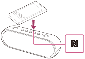 - Jei įrenginį priliesite prie garsiakalbio, įrenginys nutrauks BLUETOOTH ryšį su dabartiniu įrenginiu (su NFC suderinamomis ausinėmis ir pan.) ir prisijungs prie garsiakalbio (prijungimas vienu palietimu).