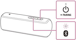 (BLUETOOTH) begynder at blinke hurtigt blåt, første gang du tænder højttaleren efter køb, eller når der ikke er gemt parringsoplysninger på højttaleren.* Afhængigt af lydtilstanden varierer farven på indikatoren