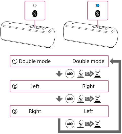 Når du trykker på knappen ADD (Tilføj højttaler) og holder den nede, sendes stemmevejledningen fra højttaleren, og tilstanden ændres.