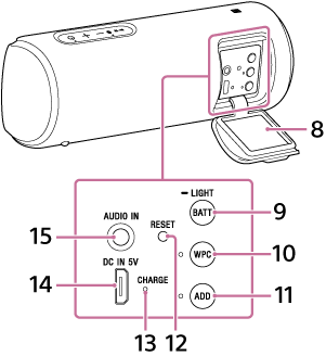 Belysningen som er bygd inn i høyttaleren er slått på/av når du trykker og holder denne knappen i omtrent 3 sekunder. - WPC (Wireless Party Chain)-knapp med indikator