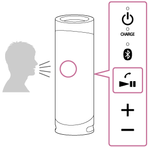 Mens telefonen ringer, eller der er en telefonsamtale i gang, skal du justere lydstyrken ved at trykke på +/- (lydstyrke)-knapperne på højttaleren eller betjene BLUETOOTH-mobiltelefonen.