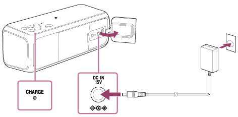 O carregamento começa e o indicador CHARGE acende a cor de laranja. O carregamento está concluído em cerca de quatro horas1* e o indicador apaga-se. Assim que a bateria esteja totalmente carregada, não será carregada mais, mesmo que a coluna seja mantida ligada a uma tomada CA.