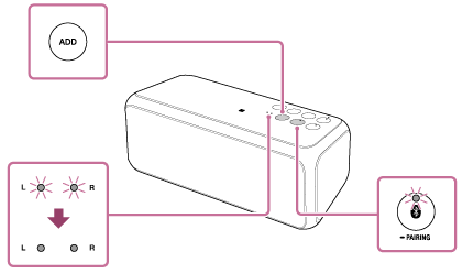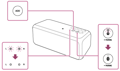 (BLUETOOTH)指示灯和L/R指示灯不闪烁的情况下,L/R指示灯即点亮。 - 在一分钟内设定第二个扬声器。如果未在一分钟内设定,第一个扬声器的设定将取消。