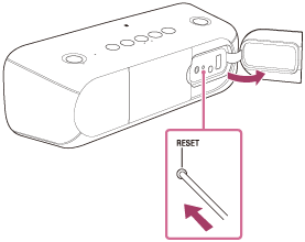Hvis højttaleren ikke kan tændes eller ikke kan betjenes, selv om den er tændt, skal du åbne hætten på bagsiden og trykke på knappen RESET med en nål eller en anden spids genstand. Højttaleren nulstilles og slukker.