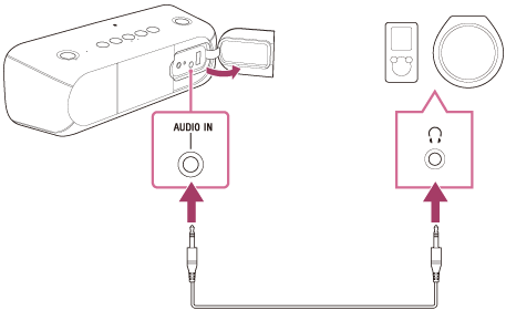 - 휴대용 오디오 장치를 AUDIO IN 잭에 연결하고 음악을 재생하는 경우 스피커의 버튼을 사용하여 일시 정지, 다음 트랙의 도입부로 건너뛰기 및 현재 트랙의 도입부로 건너뛰기 같은 작업을 수행할 수 없습니다.