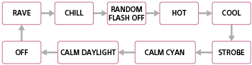 BATTERY-knappen, hör du röstvägledningen och belysningen ändras i 9 lägen*.* Vid inköpstillfället är belysningen inställd på RAVE-läget.