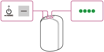 (ström)-knappen och – (volym)knappen samtidigt tills de fyra statusindikatorerna tänds i grönt.Initieringen tar ungefär 25 sekunder. När initieringen har slutförts, slås strömmen till högtalaren på igen och belysningen tänds.