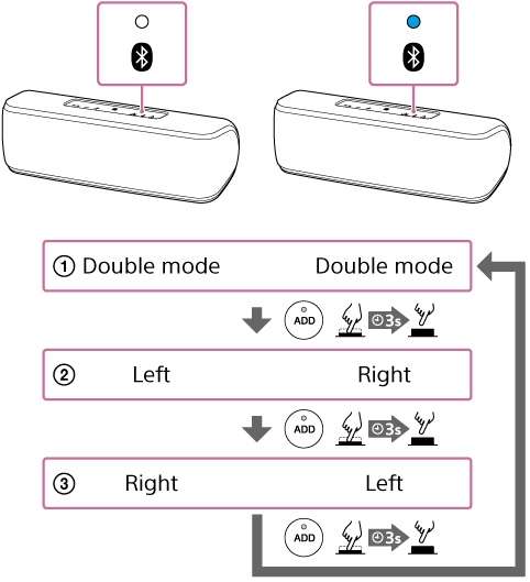Når du trykker på knappen ADD (Tilføj højttaler) og holder den nede, sendes stemmevejledningen fra højttaleren, og tilstanden ændres.