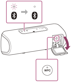 (BLUETOOTH) på højttaleren, som du tændte, begynder at blinke blåt. - Tryk på knappen WPC (Trådløs Party Chain).
