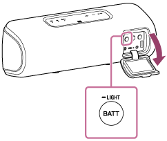 LIGHT button inside the cap on the rear side of the speaker for about 3 seconds until the lighting function turns off/on.