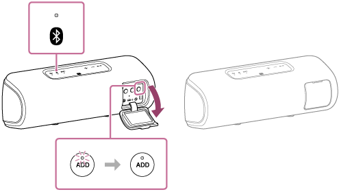 (BLUETOOTH)-indikatoren og ADD (Legg til høyttaler)-indikatoren forbli tent uten å blinke. - Sett opp den andre høyttaleren innen 1 minutt. Hvis du ikke setter den opp innen 1 minutt, avbrytes innstillingen av den første høyttaleren.