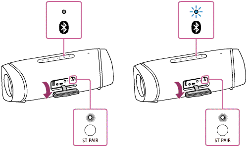 (BLUETOOTH) индикаторы және ST PAIR (Стерео режимде жұптастыру) индикаторы жыпылықтайды. Шамамен 6 секундтан кейін ST PAIR (Стерео режимде жұптастыру) индикаторы жыпылықтауын тоқтатып, жанып тұра бастайды және сигнал естіледі.
