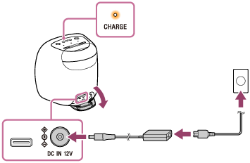 内蔵充電池が満充電の場合、スピーカーを電源コンセントに接続すると、CHARGE(充電)ランプがオレンジ色に点灯し、約1分後に消灯します。