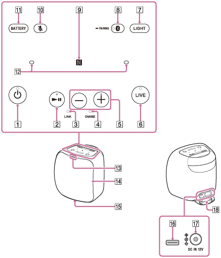 (aan/uit) toets met aanduidingOpnieuw opstarten: U kunt deze toets ongeveer 8 seconden ingedrukt houden om de luidspreker opnieuw op te starten*1.