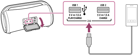 スピーカーとUSB接続することで、お手持ちのスマートフォンまたはiPhoneなどのUSB機器を充電できます。スピーカーを内蔵リチウムイオン充電池のみでお使いのときも、内蔵充電池から充電できます(おすそわけ充電)。