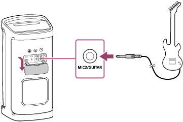 お手持ちのギターをスピーカーのMIC2/GUITAR端子(Φ 6.3 mm)につなげることによって、ギターからの音を聞くことができます。スピーカーのMIC1端子(Φ 6.3 mm)に外部マイクをつないで、ギターを弾いたり、一緒に歌ったりすることもできます。