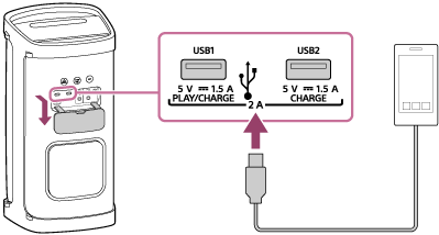 Sluit een USB-apparaat zoals een smartphone of iPhone aan op de PLAY/CHARGE-aansluiting (USB1) of de CHARGE-aansluiting (USB2) met een USB-kabel (in de handel verkrijgbaar).