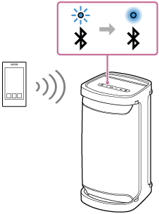 (BLUETOOTH) และไฟแสดงสถานะ PARTY CONNECT จะกะพริบ หลังจากนั้นอีกประมาณ 6 วินาที ไฟแสดงสถานะ PARTY CONNECT จะหยุดกะพริบและจะติดสว่างค้างไว้พร้อมกับเสียงบีพ ขณะกำลังเชื่อมต่อฟังก์ชันเชื่อมต่อปาร์ตี้ ไฟแสดงสถานะ