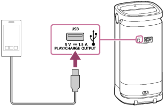 Tilslut en USB-enhed, som fx en smartphone eller en iPhone, til PLAY/CHARGE OUTPUT-porten (USB) med et USB-kabel (kommercielt tilgængeligt).