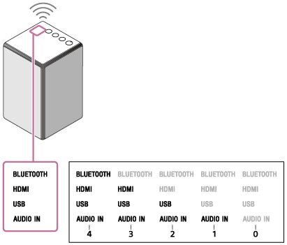 Жоғары тақтадағы функция индикаторлары (BLUETOOTH, HDMI, USB, AUDIO IN) жана бастайды.